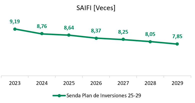 Con base en las inversiones previstas y su ejecución en el periodo 2025-2029, se proyecta el siguiente comportamiento en los indicadores de calidad media SAIDI [horas] y SAIFI [veces].